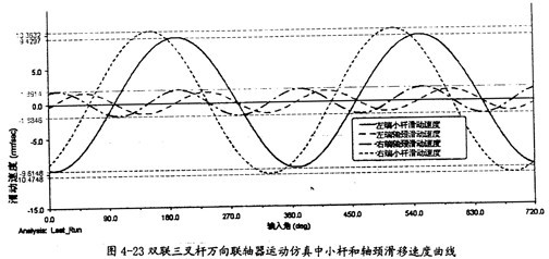 由圖4-11可以知道,在一定的夾角下,小桿在滑道中的滑移速度同小桿球面中心相對(duì)軸頸的滑移速度是不同的,前者要遠(yuǎn)大于后者,且它們變動(dòng)的頻率也不一樣,在一個(gè)回轉(zhuǎn)周期中,前者頻率是1次,而后者是2次。此圖中的兩曲線同第三章中的理論分析曲線圖3-11、圖3-12是吻合的,只是小桿滑移的速度曲線在外形上有一點(diǎn)差異,仿真的曲線相當(dāng)?shù)钠交、?guī)則,但理論分析曲線卻不規(guī)則,這可能是在計(jì)算中簡(jiǎn)化和省略的原因。盡管如此,這也證明了三叉桿式萬向聯(lián)軸器理論分析中對(duì)小桿滑移速度和軸頸滑移速度這兩項(xiàng)計(jì)算的正確性。