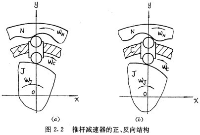 在推桿減速器中,設(shè)激波器按順時針方向旋轉(zhuǎn),則傳動圈C,內(nèi)齒圈N的轉(zhuǎn)向可能與激波器相同,也可能相反(圖2.2)。為了研究問題的方便,本文中稱傳動圈與主動件激波器轉(zhuǎn)向相同的結(jié)構(gòu)為正向結(jié)構(gòu)(圖2.2(a)),稱傳動圈與激波器轉(zhuǎn)向相反的結(jié)構(gòu)為反向結(jié)構(gòu)(圖2.2(b))。