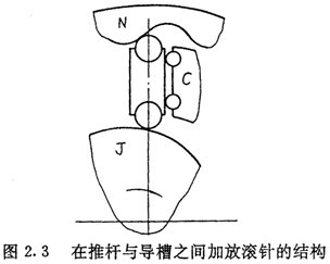 工程技術(shù)人員在實踐中圍繞著傳動圈的結(jié)構(gòu)提出了不少改進方案。一種想法是在推植與導(dǎo)槽之間加放滾針,軌圖2.3所示,使移動副轉(zhuǎn)換成通過滾動體接觸的滾動副。但由于實際生產(chǎn)中工藝上的原因,這種方法沒有被采用。