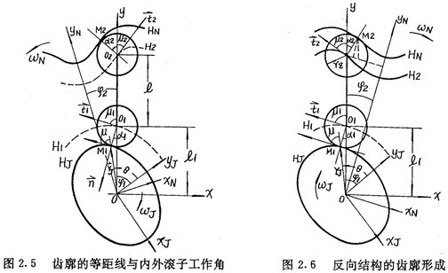 本章根據(jù)推桿減速器的結(jié)構(gòu)特征,找出了推桿內(nèi)外滾子工作角之間的關(guān)系。這種關(guān)系不僅適用于激波器廓形為偏心圓的單激波推桿減速器結(jié)構(gòu),而且也適用于激波器廓形為非圓弧曲線的多激波推桿減速器。利用內(nèi)外滾子工作角之間的關(guān)粵和法向等距線的幾何性質(zhì),首次分析研究了激波器廓形為任意形狀非圓弧曲線的多激波推桿減速器的齒廓形成理論,與傳統(tǒng)的包絡(luò)法相比,具有概念清晰,所得公式形式簡單的特點,通過實例計算,證明了激波器為偏心圓的推桿減速器,其內(nèi)齒圈齒廓曲線不是擺線這一重要結(jié)論。