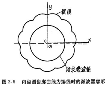 J上對應(yīng)點的坐標值。一些點的計算數(shù)據(jù)如表2.2所示,由計算機繪出的激波器廓形如圖2.9所示,它并不是一個標準的圓,圖中圓的上部稍微有點凸出。由解的唯一性可推知,激波器為偏心圓的推桿減速器,其內(nèi)齒圈廓形一定不是擺線,雖然形狀相似,其實二者是不同的,這已為工程實際所證實。