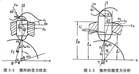 若傳動圈尺寸選用不當,或者是機構為反向結構,使FJ與FN作用力的交點Q 落在傳動圈所在環(huán)外(圖3.3所示)時,推桿呈現(xiàn)雙側受力狀態(tài)。生產(chǎn)實踐表明,推桿雙側受力將造成推桿嚴重的磨損。這種情況下推桿的受力與傳動圈外徑尺寸有關。對于圖3.3所示受力情況,對推桿質心取矩,可列出它的平衡方程式為: