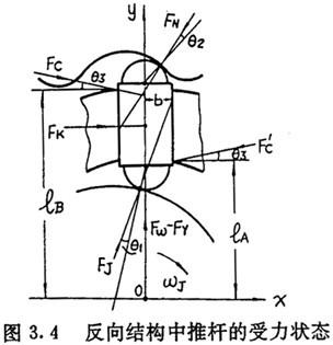 在傳動圈與激波器轉向相反的結構中,工作推桿的受力狀誠如圖3.4所示。從受力狀態(tài)圖可以看出,在運動過程中,推桿與導槽必然形成雙側接觸。推桿兩側將造成嚴重磨損,實際生產(chǎn)中,應避免使用反向結構。