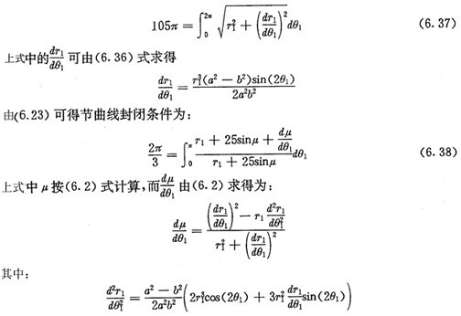 從以上設(shè)計過程可以看出,根據(jù)非圓太陽輪設(shè)計行星輪為圓的純滾動非圓行經(jīng)齒輪傳動機構(gòu)時,并不是對任意指定的太陽輪節(jié)曲線都有解。當太陽輪節(jié)曲線的周期數(shù)n1給定后,節(jié)曲線必須有兩個可調(diào)整的參數(shù)(例中的a和b)的要由節(jié)曲線的封閉條件及輪齒等分條件來確定。齒輪模數(shù)m和太陽輪齒數(shù)z1是被預(yù)先指定了的。當各參數(shù)求出后,要用不干涉條件(6.28)式進行校驗,若發(fā)生干涉,應(yīng)調(diào)整z1數(shù)值,重新計算太陽輪的可調(diào)整參數(shù)。