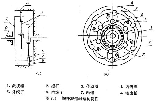 圖7.1所示為擺桿減速器的結(jié)構(gòu)簡圖。擺桿減速器也由四大部分組成:激波器1;擺動機構(gòu)(包括擺桿2,內(nèi)滾子6, 外滾子5和軸銷7);傳動圈3 以及與其固聯(lián)的輸出軸8;內(nèi)齒圈4?梢钥闯,除了擺動機構(gòu)外,其它構(gòu)成與推桿減速器類似。也采用了兩套完全相同且互成180°的激波器及內(nèi)齒圈以實現(xiàn)輸出的靜平衡和提高嚙合效率。