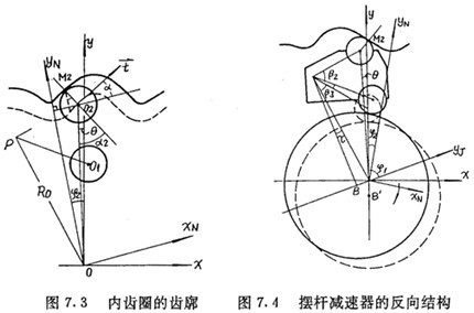 和推桿減速器一樣,當理論擺動機構(gòu)數(shù)目比內(nèi)齒圈齒數(shù)少,即ZC=ZN-1時,機構(gòu)成為圖7.4所示的反向結(jié)構(gòu),在此結(jié)構(gòu)中,擺桿外滾子中心在與內(nèi)齒圈固聯(lián)的
