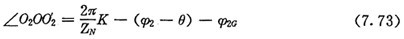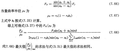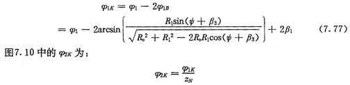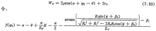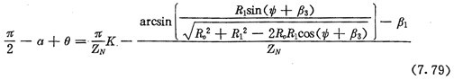 由式(7.71)及式(7.73)可得齒廓AB上與跨槽數(shù)為K的齒郭具有公法線的點的條件式為: