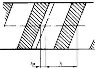 當(dāng)各齒通過(guò)嚙合時(shí),單個(gè)齒距偏差在切向綜合位移圓弧上有累積作用。這種影響在切向綜合偏差圖上看得很清楚,這樣,可確定齒距累積偏差值,(比如k=2.3,…)即在適當(dāng)數(shù)量的齒距間測(cè)頂點(diǎn)切線的縱坐標(biāo)。圖28中表示了單個(gè)齒距偏差、單個(gè)齒距和齒廓組合偏差以及近似的齒距累積總偏差。
