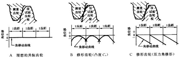 圖26所示意的是相當(dāng)于三種不同齒廓的產(chǎn)品齒輪與測(cè)量齒輪相嚙合產(chǎn)生的三個(gè)齒嚙合周期的切向綜合偏差記錄圖,第一個(gè)表示無(wú)修形也無(wú)誤差,第二個(gè)則表示自齒高中部開(kāi)始到有效齒廓兩端逐漸修形,而第三個(gè)則表示有“傾斜偏差”。