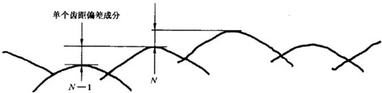 如果在齒距N處產(chǎn)生一個(gè)齒距偏差,是當(dāng)旋轉(zhuǎn)接觸過(guò)程從N-1齒轉(zhuǎn)移到N齒時(shí),一個(gè)局部的切向分量將顯示在切向綜合偏差圖上,它表現(xiàn)為圖上齒廓展成分量中一個(gè)分量的位移。