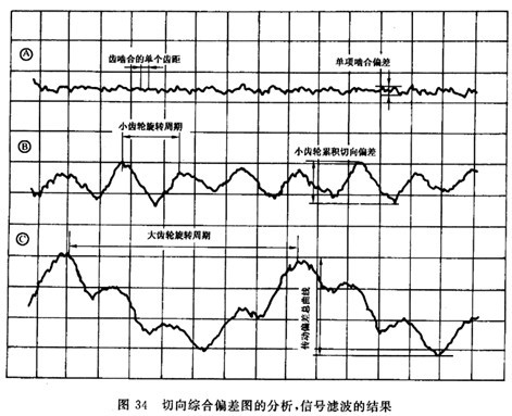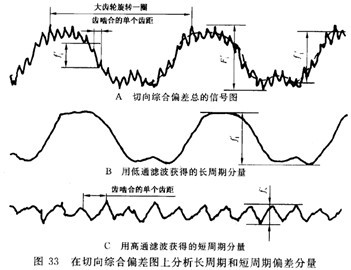 重要的事是記住,在濾掉長(zhǎng)周期分量后,一齒切向綜合偏差fi′(圖33A)實(shí)際上變小了,這樣真正的最大偏差fi′就未必能在經(jīng)濾波后的短同期分量的曲線(圖33C)中表示出來(lái)。