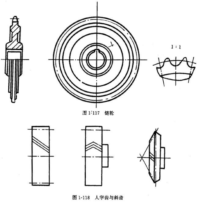 ⑤當(dāng)需要表示齒線的形狀時(shí),可用三條與齒線方向一致的細(xì)實(shí)線表示(圖1-116、1-118)。直齒則不需表示。