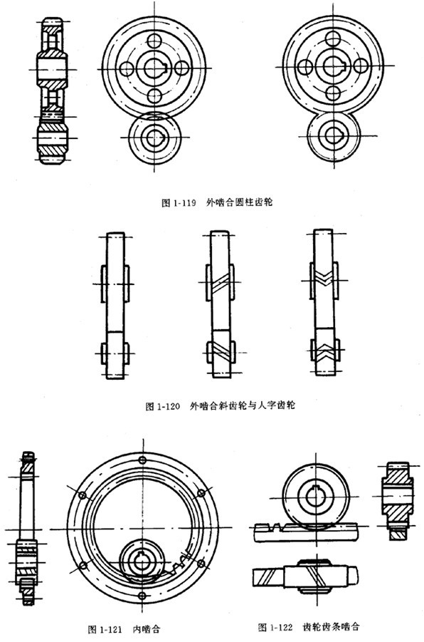 ⑤圓柱齒輪嚙合的畫法見圖1-119。外嚙合斜齒輪與人字齒輪見圖1-120。