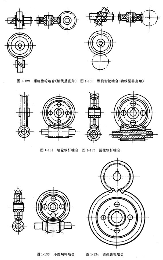 ⑧螺旋齒輪嚙合的畫法見圖1-129、1-130。