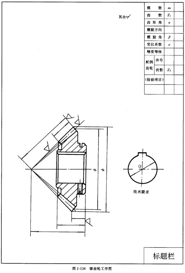 僅列舉出圓柱齒輪(圖1-135)、圓錐齒輪(圖1-136)、蝸桿(圖1-137)和蝸輪(圖1-138)的圖樣格式。