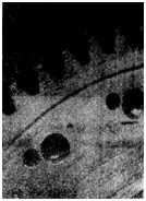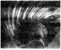 本圖是圖40中的人字齒輪局部放大,齒面到處可見(jiàn)大量均勻分布的電蝕斑點(diǎn)。