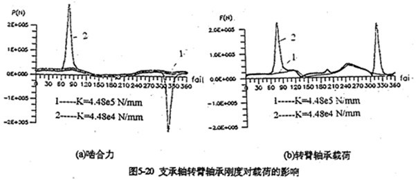 只考慮行星軸承變形及齒板變形時(shí),影響三環(huán)減速器載荷特性的剛度,主要是行星軸承剛度、和內(nèi)齒圈的變形剛度。軸承剛度與軸承材料、間隙、油膜等很多因素有關(guān)。圖5-19是輸入軸行星軸承剛度對(duì)嚙合力及行星軸承載荷的影響。當(dāng)輸入行星軸承剛度小一個(gè)數(shù)量級(jí)時(shí),負(fù)向嚙合力區(qū)域增大(見圖5-19a);隨剛度減小、各相嚙合力越不均恒(圖5-19b),輸入軸行星軸承剛度的影響比輸入軸行星軸承剛度更大,見圖5-20所示。嚙合力及各行星軸承載荷在軸承剛度較小的情況時(shí),都出現(xiàn)正常載荷的10倍以上的沖擊現(xiàn)象,沖擊產(chǎn)生的位置隨剛度變化不同。內(nèi)齒圈剛度對(duì)載荷的影響與行星軸承剛度相反(見圖5-21所錄)。當(dāng)剛度越小時(shí),三相齒板的嚙合力越均恒(見圖5-21a),而且行星軸承載荷幅值基本上不變(見圖5-21b)。同此可推知,減小三環(huán)減速器振動(dòng)的途徑之一就是提高行星軸承剛度,減小內(nèi)齒圈剛度。這可以通過對(duì)行星軸承進(jìn)行預(yù)緊,和采用軟齒面或大柔度齒圈的辦法,以使嚙合力和行星軸承載荷均衡化,以達(dá)到減振降噪的目的。