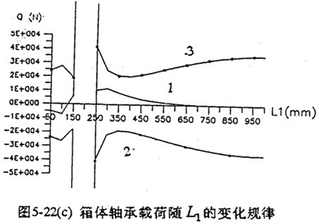 各軸水平布置時(shí),軸間的中心距變化,將引起各載荷大小幅值、規(guī)律均發(fā)生變化。圖5-22是輸入軸相對(duì)輸出軸位置變化時(shí),減速器的嚙合力及軸承載荷變化情況。由圖可知,當(dāng)輸入軸與支承軸中心距(L2=200mm)很小時(shí),三齒板的嚙合力分配很不均衡,隨著L1的增加嚙合力趨于均衡(見圖5-22a)。行星軸承載荷變化情況見圖5-22b所示。