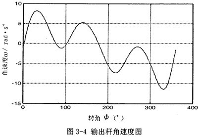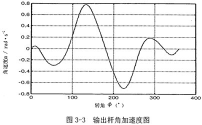 首先由圖3-2可以看到,若機(jī)構(gòu)結(jié)構(gòu)參數(shù)設(shè)計(jì)恰當(dāng),并且調(diào)整中間滑塊3偏移到合適的位置時,可在一定范圍內(nèi),產(chǎn)生一個反向的速度波適度抵消原速度波動。再由圖3-3可知,在未加入第二自由度時,加速度變化值不大,說明阻力矩和電機(jī)主動力矩不會受到大的影響,不致導(dǎo)致原機(jī)械系統(tǒng)的各項(xiàng)參數(shù)發(fā)生大的變化。