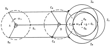眾所周知,雙曲柄機(jī)構(gòu)的最大缺點(diǎn)就是存在死點(diǎn)位置,即當(dāng)曲柄,與連桿共線時(shí),機(jī)構(gòu)處理運(yùn)動(dòng)不確定位置,其傳動(dòng)角為零,機(jī)械無法運(yùn)動(dòng)。為了克服死點(diǎn)位置,目前已出現(xiàn)了三種解決方法:其一是在同一行星輪上布置多套雙曲柄機(jī)構(gòu)的方法:其二是采用雙曲柄動(dòng)力輸入式方法;基三是采用多相并列式雙曲柄機(jī)構(gòu)來克服死點(diǎn)的方法。三環(huán)減速器就是用三相并列雙曲柄機(jī)構(gòu)來克服死點(diǎn)位置,如圖2-2所示。