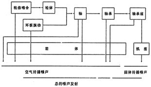 從圖中可知,固體傳播噪聲是由傳遞中的振動(dòng)激勵(lì)引起的,環(huán)板沖擊及輪齒嚙合振動(dòng)通過軸、軸承、軸承座傳向箱體和機(jī)座;引起振動(dòng)而輻射的噪聲通過箱壁向外輻射,此外,由軸的振動(dòng)引起的噪聲的一部分直接向箱體外輻射。