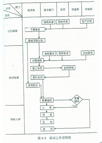 第四步競(jìng)購(gòu)。由進(jìn)入競(jìng)購(gòu)范圍的供應(yīng)單位或個(gè)人向供應(yīng)科提交申報(bào)單,載明:所競(jìng)購(gòu)物資名稱、產(chǎn)地、規(guī)格、數(shù)量、質(zhì)量、價(jià)格、交貨期、供應(yīng)渠道、售后服務(wù)等,一式兩份呈報(bào)物管辦和供應(yīng)科公開(kāi)進(jìn)行競(jìng)購(gòu)。供應(yīng)科根據(jù)生產(chǎn)供應(yīng)計(jì)劃和所掌握的最低競(jìng)價(jià),選定2~3家為供貨單位,報(bào)物管辦備查。最后由供應(yīng)科與供貨單位簽訂合同,具體實(shí)施物資采購(gòu)進(jìn)廠。 競(jìng)購(gòu)成功并簽訂合同的供貨單位須按合同要求,及時(shí)、保質(zhì)保量地供貨。若中途違約或物資使用過(guò)程中發(fā)現(xiàn)內(nèi)在質(zhì)量問(wèn)題而造成損失、影響生產(chǎn),則按規(guī)定承擔(dān)違約責(zé)任。凡違約或質(zhì)量問(wèn)題影響生產(chǎn)兩次以上者,一律取消其競(jìng)購(gòu)資格。 全程監(jiān)控 為明確各方面責(zé)任,公司從提出用料申請(qǐng)、編制物資采購(gòu)計(jì)劃開(kāi)始,到驗(yàn)收入庫(kù)、生產(chǎn)使用為止,制定了詳細(xì)的業(yè)務(wù)流程,所有環(huán)節(jié)一律按工作程序進(jìn)行全程管理。詳見(jiàn)圖4—2采購(gòu)工作流程圖。 成本管理科將上述流程活動(dòng)中所涉及的各類信息資料如原輔材料的價(jià)格、質(zhì)量、數(shù)量、供貨單位及聯(lián)系人、責(zé)任人等輸入微機(jī),隨時(shí)進(jìn)行查詢、分析、全程追蹤監(jiān)控。