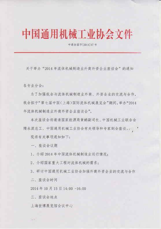 為了加強(qiáng)我會(huì)與流體機(jī)械制造業(yè)外商、外資企業(yè)的交流與合作,我會(huì)擬于“第七屆中國(上海)國際流體機(jī)械展覽會(huì)”期間,舉辦“2014年流體機(jī)械制造業(yè)外商外資企業(yè)座談會(huì)”。