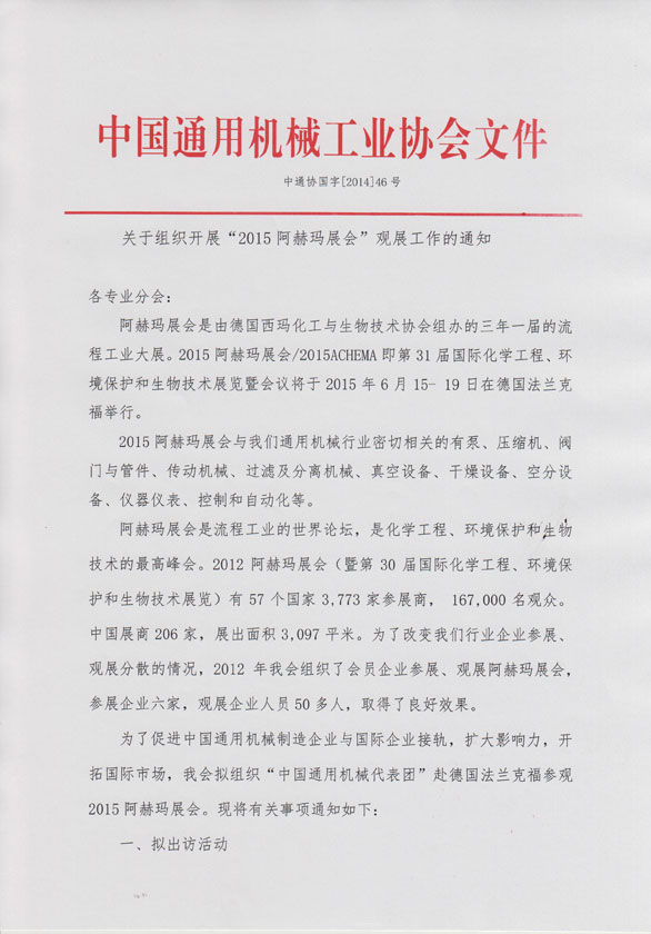 2015年減變速機(jī)分會(huì)與中國通用機(jī)械工業(yè)協(xié)會(huì)共同組織減變速機(jī)行業(yè)企業(yè)觀展2015阿赫瑪展會(huì)。根據(jù)中國通用機(jī)械工業(yè)協(xié)會(huì)要求9月25日前上報(bào)觀展人員名單,具體事宜請(qǐng)參考中通協(xié)國字【2014 】46 號(hào),有意向觀展的企業(yè)請(qǐng)抓緊時(shí)間上報(bào)名單。