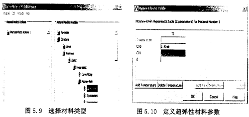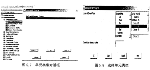 考慮到分析橡膠材料所能用到的單元,選擇Main Menu>Preprocessor>Element type>Add/Edit/Delete,在出現(xiàn)的對話框中,單擊“Add”,如圖5.7所示。這時又出現(xiàn)一個“Library of Element Type”對話框,在左面的列表欄中選擇“Structural Solid”,在其右面的列表欄中選擇“2Onode186”,單擊0K按鈕,如圖5.8。再在單元對話框中單擊Close按鈕關(guān)閉對話框。