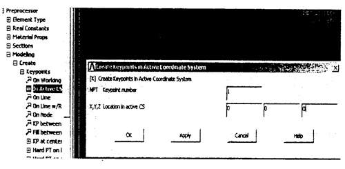 選擇Main Menu>Preprocesor>Modeling>Create>Keypoints>In Active CS,在彈出的對話框中輸入1關(guān)鍵點的坐標(biāo),如圖5.11所示。單擊“Apply”輸入下一個點的坐標(biāo)直至所有關(guān)鍵點完全輸入。6個關(guān)鍵點的坐標(biāo)如表5.1所示。