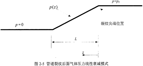 更為簡便的是圖2-5所示的氣體壓力衰減模式是線性衰減函數(shù),圖中以裂紋擴展方向z為橫軸,壓力分布p為縱軸,其計算表達式為