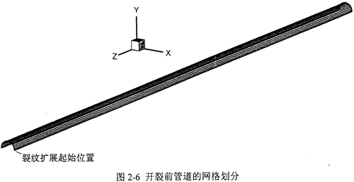 管道上的裂紋一般從起裂點同時向兩側(cè)擴展。因管道幾何形狀和載荷分布具有對稱性,本文取一側(cè)管道的一半來分析和計算,即四分之一模型,如圖2-6所示。采用四節(jié)點板殼單元,沿管道軸向和環(huán)向分別劃分網(wǎng)格,在管道內(nèi)壁給出氣體壓力分布。