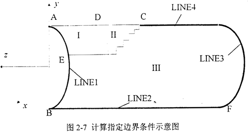 在圖2-7中,C點表示裂尖位置:裂紋沿LINE4擴展,在A、B點和邊界LINEl、LINE2、LINE3和LINE4上施加不同的邊界條件。I、Ⅱ和Ⅲ區(qū)代表卸載區(qū)、減壓區(qū)和裂前區(qū):其中,點A、B和邊界LINEl、LINE2、LINE3是約束邊界條件,C點和邊界LINE4為運動邊界條件。I、Ⅱ及Ⅲ區(qū)隨時間而變化。