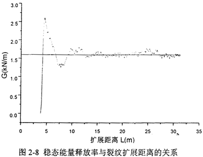 如圖2-8,隨著裂紋起裂后的迅速擴展,裂紋驅(qū)動力上升直至達到并保持在穩(wěn)定的數(shù)值,這一平臺值1.6KN/m就是裂紋穩(wěn)態(tài)(steady state)擴展的驅(qū)動力G。裂紋尖端的移動過程中,G在該值附近有一些小的波動,這是由于裂紋長度的突然增加和位移約束的突然解除,引起的有限元解的高頻振蕩。振蕩的幅度與有限元單元網(wǎng)格的疏密和單元內(nèi)節(jié)點力釋放的指定規(guī)律有關(guān)。