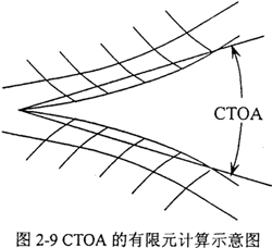 圖2-9表示了CTOA的計算方法。由于在裂紋后方有很大的非線性變形,計算中張開位移用割線近似,采用8個單元的長度來計算CTOA。這一長度經(jīng)過與細化后的網(wǎng)格結(jié)果比較,誤差在10%之內(nèi)。