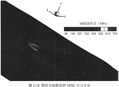 首先觀察裂尖附近的MISES應(yīng)力分布,如圖2-10。按以針狀鐵素體和塊狀鐵素體組織為主的X70鋼級管線鋼的平均屈服強度500~600MPa估算,計算給出的裂尖前部塑性區(qū)長度大約在3個單元長度以內(nèi),即0.15m左右。