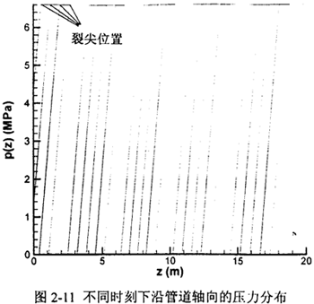 圖2-11直觀地給出了內(nèi)壓10MPa,裂紋速度216m/s時一維管道氣體壓力模型(L=1.5D)下的管壁壓力沿軸向的分布。每條曲線的衰減起始點即為該時刻的裂尖位置。圖中裂尖壓力約為6.6MPa。