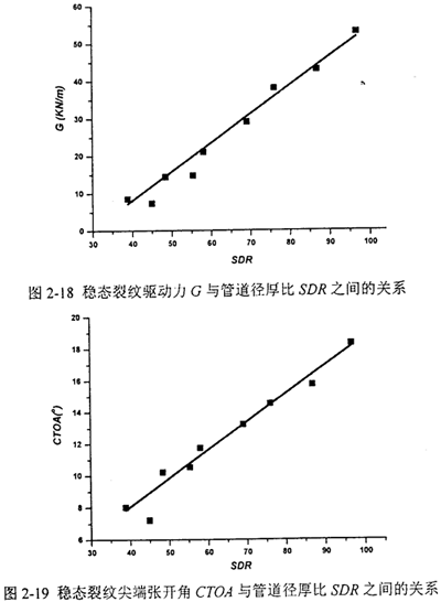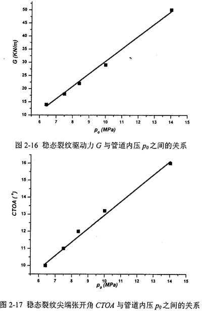 在裂紋穩(wěn)態(tài)擴(kuò)展的條件下,動(dòng)態(tài)能量釋放率G或裂紋尖端張開(kāi)角CTOA同管道內(nèi)壓p0或徑厚比SDR之間均呈線(xiàn)性關(guān)系。由此關(guān)系可便捷地推算任意設(shè)計(jì)參數(shù)下的裂紋驅(qū)動(dòng)力。通過(guò)和第四章介紹的小試件實(shí)驗(yàn)的動(dòng)態(tài)斷裂韌性結(jié)果相對(duì)照,可以得到裂紋止裂或擴(kuò)展的結(jié)論。