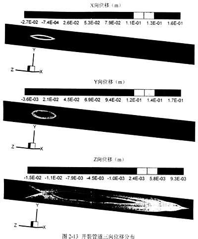 圖2-13分別按照三個(gè)方向上的位移分布在開(kāi)裂前管道表面畫(huà)出云紋圖。從圖中可以看到,此種設(shè)計(jì)參數(shù)下的位移量主要發(fā)生在裂尖附近5m左右的區(qū)域,對(duì)遠(yuǎn)端的影響較小。