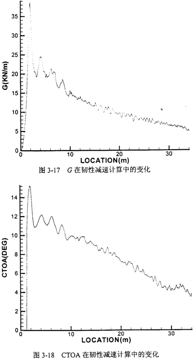 圖3-17和圖3-18是針對(duì)西氣東輸某特定設(shè)計(jì)參數(shù)的管線,應(yīng)用韌性減速機(jī)理計(jì)算時(shí)能量釋放率G和裂紋尖端張開(kāi)角CTOA的變化。
