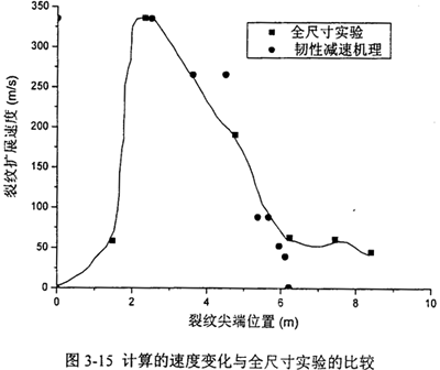 本文通過(guò)上述方法,對(duì)圖3-9至圖3-12中的全尺寸實(shí)測(cè)斷裂速度曲線結(jié)果進(jìn)行了校核,得到了比較吻合的結(jié)果,F(xiàn)以聯(lián)盟管道第一次實(shí)驗(yàn)IE段為例,設(shè)定擴(kuò)展的初速度為330m/s,速度變化的計(jì)算值同實(shí)驗(yàn)對(duì)比如圖3-15所示: