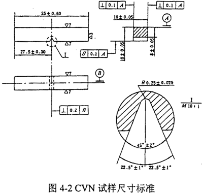 GB2106-80和ASMME23-96規(guī)定試樣標(biāo)準(zhǔn)尺寸為10×10×55mm,缺口深度為2mm。對(duì)于2/3尺寸試樣,厚度減為6.67mm,截面尺寸不變,如圖4-2。