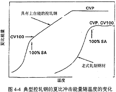 對(duì)于斷口上有分離的材料,隨溫度的升高,分離將最終消失,這是因?yàn)轳R氏體和貝氏體帶也達(dá)到了上平臺(tái)溫度。圖4-4表示典型控軋鋼的夏比能量隨溫度的變化。夏比沖擊試樣上100%剪切面積對(duì)應(yīng)的最小夏比能稱為CV100。當(dāng)所有的分離都消失時(shí),上平臺(tái)能CVP出現(xiàn),其大小可能高于CV100。
