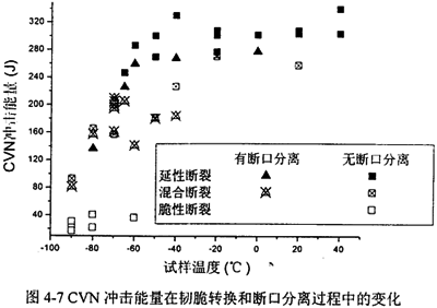 圖4-7選擇的管線鋼在實(shí)驗(yàn)溫度范圍內(nèi)同時(shí)經(jīng)歷了韌脆轉(zhuǎn)化和斷口分離,對(duì)上述結(jié)論給予了證實(shí),并可以看到發(fā)斷口分離的試件的韌性稍低于未發(fā)生斷口分離的試件。