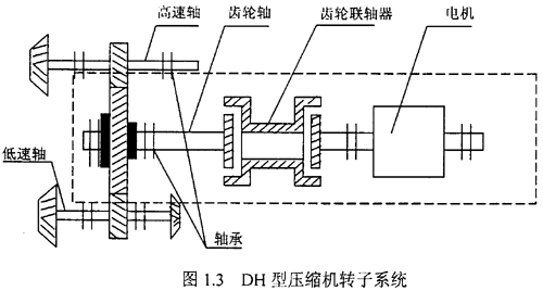 本課題來源于某工程應用研究“雙軸型透平壓縮機軸承轉(zhuǎn)子系統(tǒng)動力學分析”。圖1.3 是DH 型壓縮機轉(zhuǎn)子系統(tǒng)。在G 軸與電機軸之間采用齒輪聯(lián)軸器聯(lián)接。本文主要對圖1.3 虛線部分,G 軸、電機軸、齒輪聯(lián)軸器轉(zhuǎn)子系統(tǒng)進行討論