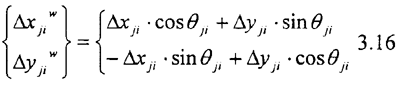 第i個齒上的旋轉坐標坐標軸Xjiw是分度圓齒廓切線方向,Yjiw是齒廓法向方向,Ojiw是軸向第j個分割微元的中心,OjN-XjNYjN表示與外齒第j分割微元對應的固結在內齒相應分割微元上的坐標,OjN是分割微元的中心,因為假設內齒輪固定,所以OjN-XjNYjN與Oj-XjYj重合,OjiN-XjiNYjiN:是固結在分割微元第i個的旋轉坐標j=1,2……M,i=1,2……Nz。將Δxji, Δyji投影響到Ojiw-XjiwYjiw坐標中: