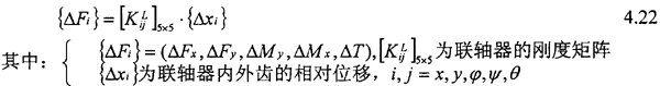 因此通過聯(lián)軸器的剛度[KijL]5×5(由第三章求得)把動(dòng)態(tài)力和力矩表示成內(nèi)外齒相對(duì)位移的顯函數(shù),從而得到齒輪聯(lián)軸器連接軸系的彎曲和扭轉(zhuǎn)振動(dòng)方程。
