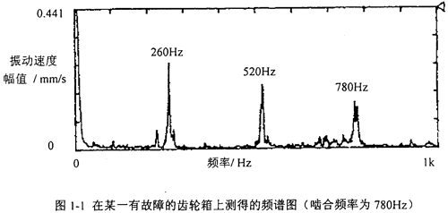 齒輪在傳動過程中,輪齒是不斷地處在一齒與兩齒交替咬合狀態(tài),對于斜齒輪,是不斷地處在兩齒與三齒交替咬合狀態(tài)。當齒側(cè)有間隙時,此時的振動體系是時變的非線性系統(tǒng);輪齒間隙過大時還會出現(xiàn)瞬時脫齒狀態(tài)。因此,齒輪所產(chǎn)生的振動除了和輪齒嚙合剛度時變性有關(guān)外,還和齒輪的制造誤差(如質(zhì)量偏心、齒距偏差和齒形誤差)、裝配不良(如兩個齒輪軸心線不平行)、齒輪正常損傷(如齒輪正常磨損等)和齒輪非正常損傷(如齒面疲勞點蝕、齒面剝落、齒面燒傷、塑性變形和膠合撕傷等)有關(guān)。人們一般都認為,齒輪在振動時其振動故障頻率為齒輪嚙合頻率的n倍(n=l,2,3,…),但實際情況并不完全如此,如在圖1-1中,齒輪振動故障頻率為齒輪嚙合頻率的1/3、2/3和3/3倍,振動速度的幅值也較齒輪正常時大一些;在另外一些場合,齒輪振動故障頻率為n/m倍(n,m皆為正整數(shù))。因此很有必要對產(chǎn)生分數(shù)倍亞諧和超諧振動的原因作深入的研究工作。