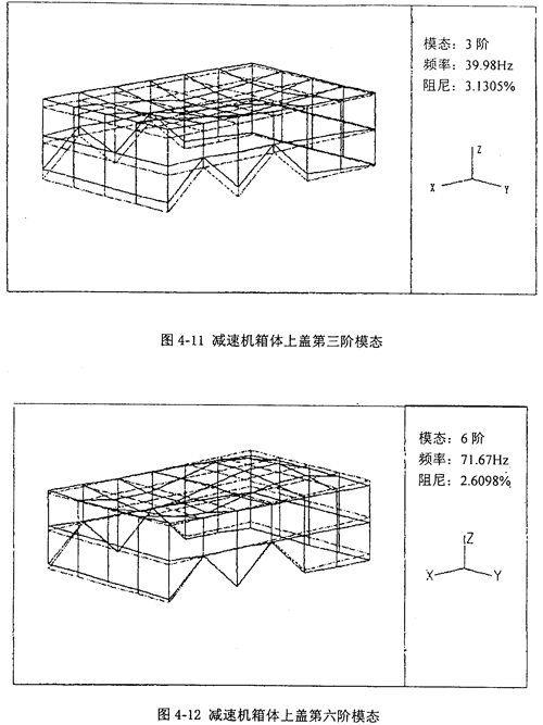 減速機(jī)箱體上蓋振動(dòng)模態(tài)可分為減速機(jī)箱體上蓋側(cè)滾(剛體模態(tài))、減速機(jī)箱體上蓋整體振動(dòng)、減速機(jī)箱體上蓋彎曲和減速機(jī)箱體上蓋頂蓋局部振動(dòng)。
