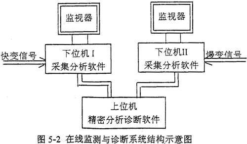 為了適應(yīng)日益更新的生產(chǎn)實(shí)際多種類(lèi)型參數(shù)監(jiān)測(cè)和故障診斷的要求,建立由多臺(tái)微機(jī)并行運(yùn)行構(gòu)成的在線連續(xù)實(shí)時(shí)監(jiān)測(cè)與快速診斷系統(tǒng)。圖5-2為多微機(jī)在線監(jiān)測(cè)與診斷系統(tǒng)結(jié)構(gòu)示意圖。這樣做的優(yōu)點(diǎn)是: